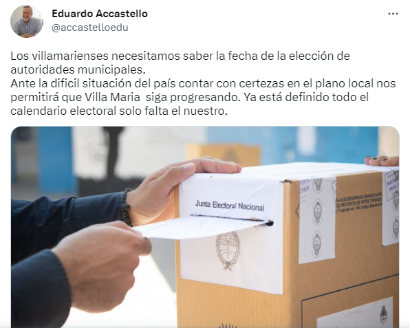Este fin de semana, mediante la red social Twitter, el ex intendente Eduardo Accastello y actual ministro de Industria, Comercio y Minería de la Provincia, solicitó que es necesario que se ponga fecha a la elección para intendente en Villa María. Así lo destacó en la red del pajarito: