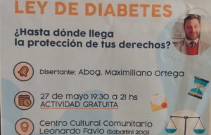 Este viernes 27 de mayo, a las 19:30, en el Centro Cultural Leonardo Favio (Sabattini 200) se llevará a cabo una disertación sobre la Ley de Diabetes con la organización de Asadd, Asociación de ayuda y difusión de la diabetes Villa María. En este caso, se contará con la presencia del Abogado Maximiliano Ortega, quien será el encargado de ilustrar sobre la temática y despejar cada una de las inquietudes que presenten los asistentes a la charla.