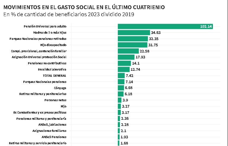 Más atrás en valores absolutos, pero saltando al primer lugar en términos relativos, se ubicó la “Pensión Universal para Adulto”, pasó de 136.384 en 2019 a 275.681 en el estimado para 2023, podría explicarse por la secuela de la crisis sanitaria de Covid-19 en 2020, que dejó fuera del mercado laboral a muchas personas que no habían completado o registrado aportes al Sistema Integrado Previsional Argentino. Se prevé en el Presupuesto 2024 que parte de ese incremento se revierta, porque pasarían a ser perceptores de una jubilación o pensión, a través de la moratoria previsional que el Gobierno reabrió en los últimos meses.