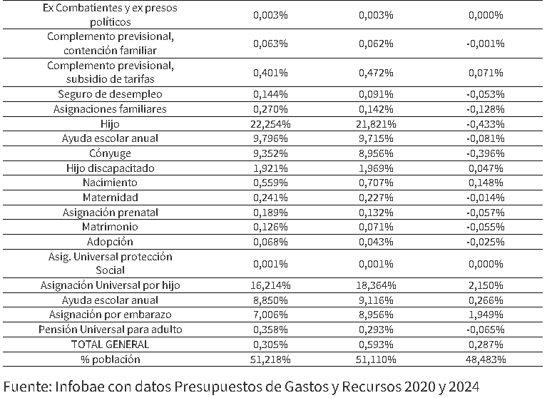 También sobresalieron con un crecimiento muy superior al de la tasa vegetativa de la población la cantidad de perceptores del subsidio por “hijo discapacitado”, subió 31,8%, a 329.078 personas, y se prevé se eleve a 346 mil el año próximo; y las “Madres de 7 o más hijos” (34,6%), a 264.179 beneficiarias, aunque en este caso el Presupuesto 2024 da cuenta de una leve baja a menos de 248 mil.