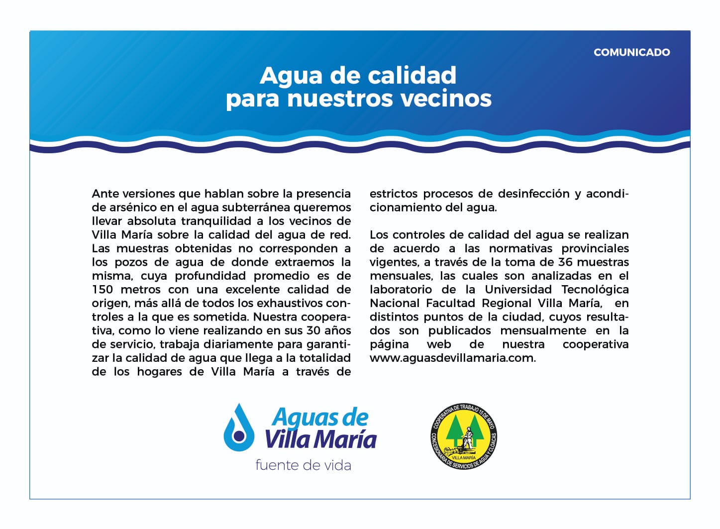 Luego que se conociera públicamente un informe sobre la preocupante presencia de arsénico en el agua a nivel subterráneo a nivel local y regional, desde Aguas de Villa María señalaron lo siguiente en un comunicado dirigido a la población: