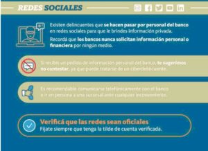 Los perfiles falsos generalmente tienen pocas publicaciones, muy recientes, baja cantidad de seguidores y no cuentan con la autenticidad del tilde azul. Otro factor a tener en cuenta es que el Banco nunca solicitará datos de las cuentas, personales, contraseñas o información sensible a través de sus redes sociales o correo electrónico.