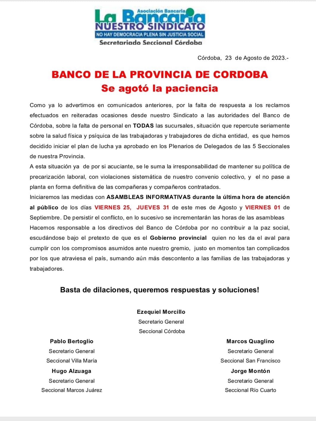 Mediante un comunicado de prensa, Pablo Bertoglio de la Asociación Bancaria, nos destacó que desde este viernes, los trabajadores realizarán asambleas de una hora en el Banco de la Provincia de Córdoba. La forma en la que se dará esa asamblea fue ampliada en dicho comunicado: