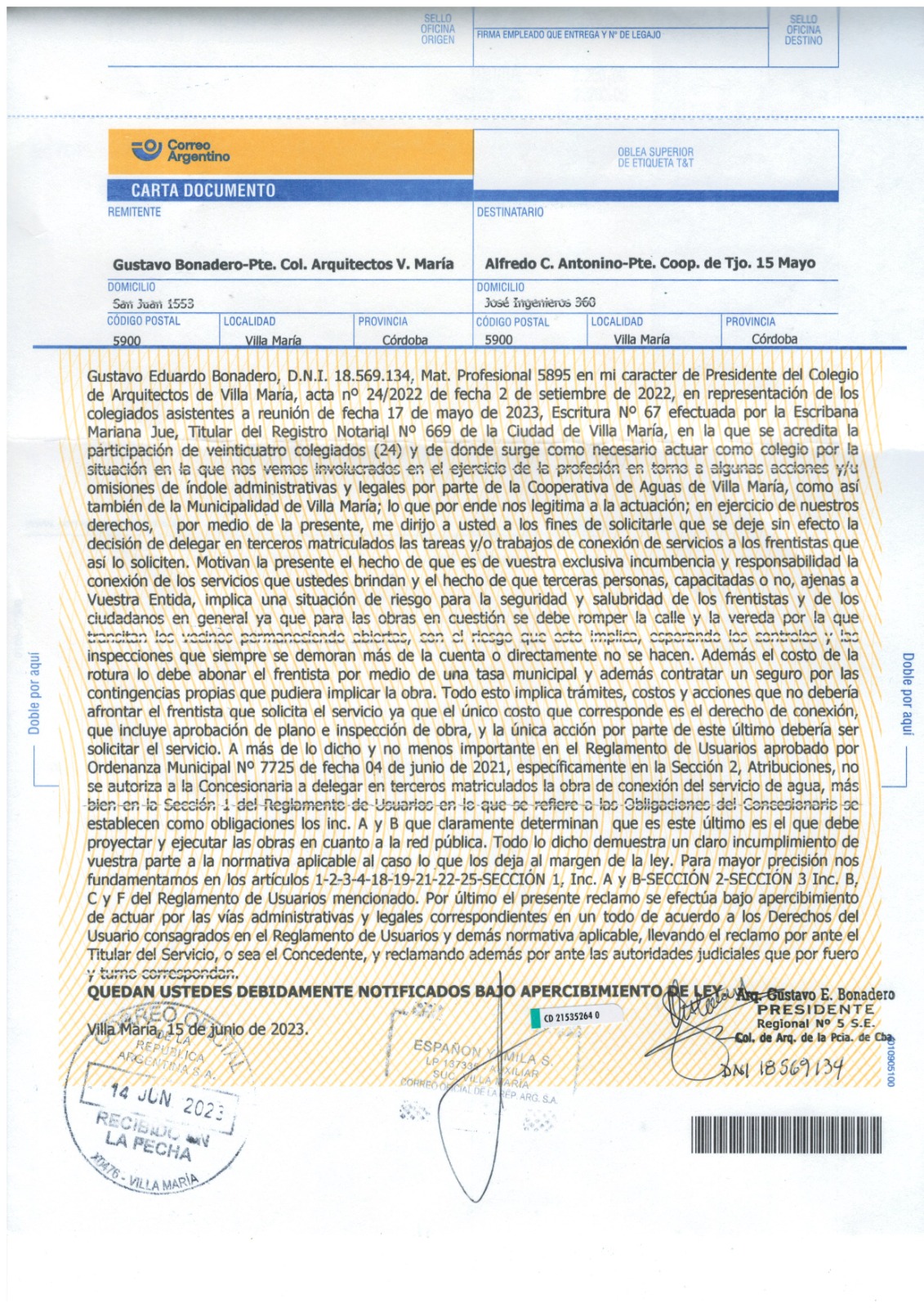 En relación a las dos solicitadas previas realizadas por ambos colegios donde rechazan la modalidad con la que proponen colocar los medidores de agua, y en donde pretenden que los frentistas paguen a terceros por esa instalación, han enviado una carta documento donde hacen notar que estarían fuera de la normativa vigente.