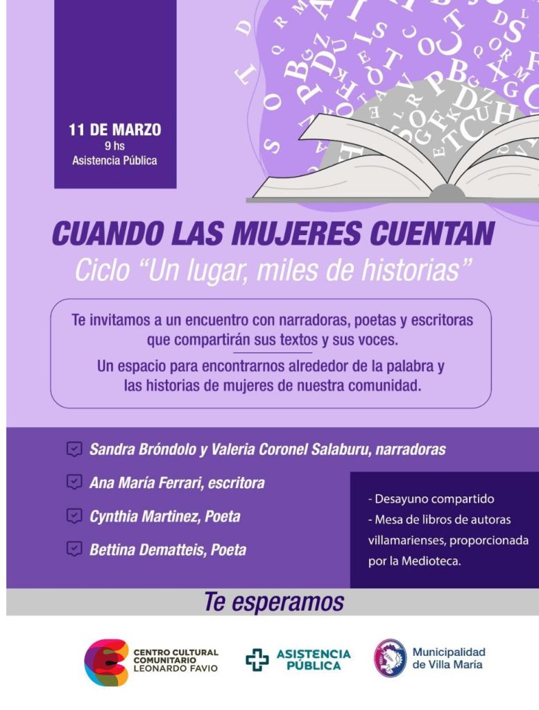 La Municipalidad de Villa María invita a la comunidad a formar parte de la propuesta “Cuando las mujeres cuentan”, una jornada de narración, poesía y literatura en el marco de las actividades por el Día Internacional de la Mujer, que el Gobierno local lleva a cabo durante todo el mes de marzo.