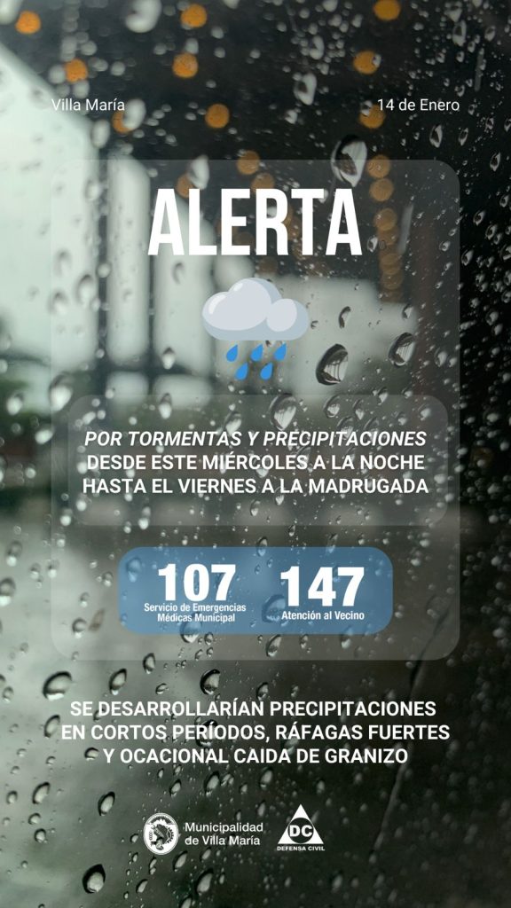 Desde la Municipalidad de Villa María informaron sobre la posibilidad de tormentas que rige hasta este viernes por la madrugada.