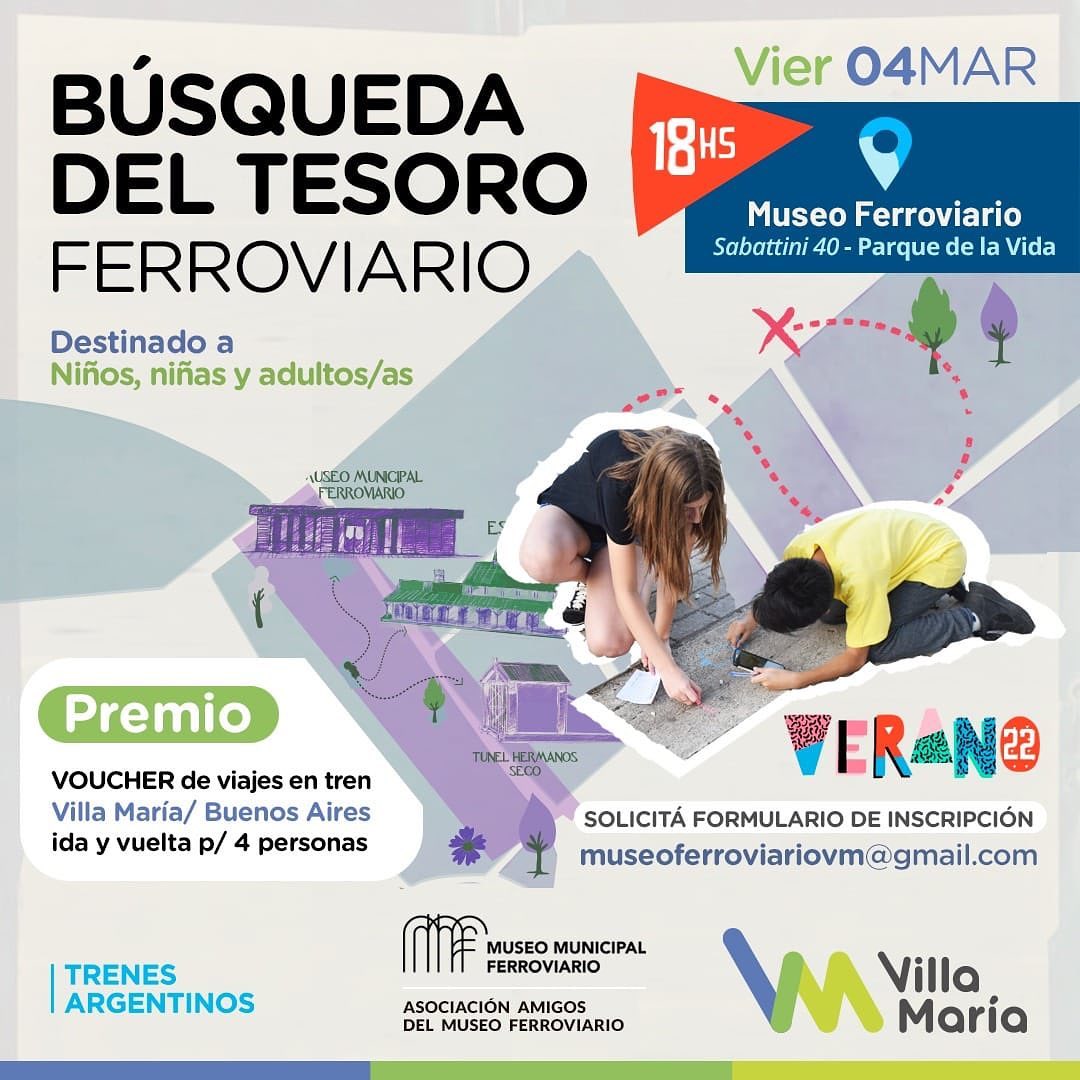 El evento se realizará el día viernes 04 de marzo a las 18 hs en el Museo Ferroviario, Av. Sabattini 40 (Parque de la vida). Será una actividad para Niños, niñas y adultos con ganas de jugar a la búsqueda del tesoro, conocer la historia de nuestra ciudad y ganar un viaje a Buenos Aires junto a Trenes Argentinos.
