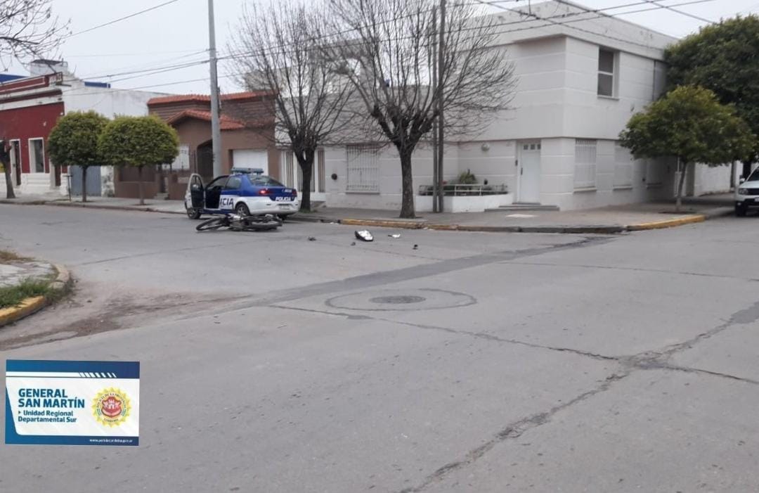 Esta mañana, en calle La Rioja y México, por razones que se tratan de establecer colisionó una motocicleta marca Motomel, modelo Skua, conducida por un hombre de 24 años de edad, con un automóvil que se dio a la fuga.