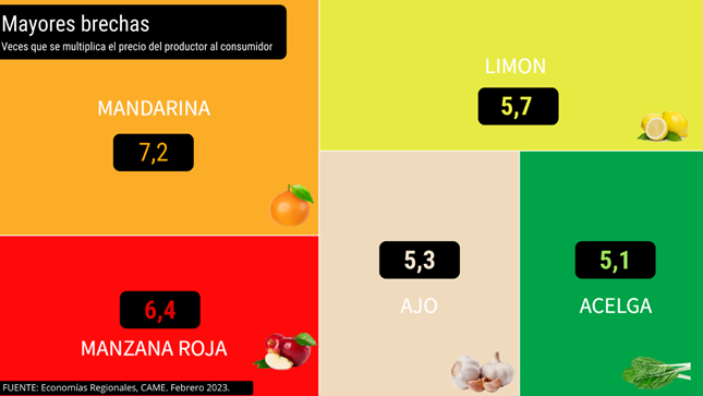 La mandarina (7,2 veces), la manzana roja (6,4), el limón (5,7), el ajo (5,3) y la acelga (5,1), fueron los 5 productos que presentaron mayor diferencia entre los precios de origen y destino.