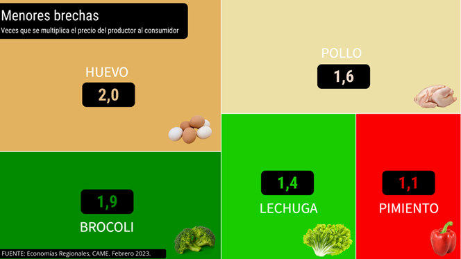 Con respecto a la baja brecha campo-góndola de los productos y subproductos ganaderos, los huevos (2) y el pollo (1,6), por lo general, tienen sistemas de producción integrados, lo que significa que todos los actores de sus respectivas cadenas de valor son parte del riesgo del negocio.