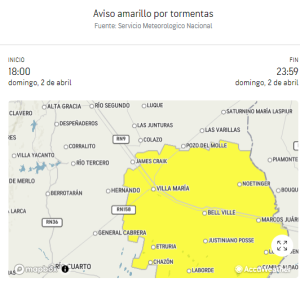 El Servicio meteorológico nacional publicó un alerta meteorológico por tormentas fuertes para Villa maría y la región desde las 18 horas hasta las 00 horas.