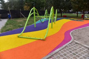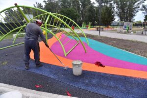 El espacio de juegos contará con un piso de caucho que ayudará a evitar golpes para brindar más seguridad a los niños y niñas. Precisamente, los juegos de vanguardia, aptos para niños mayores de 3 años, se encuentran montados en el lugar definitivo para que la empresa a cargo del emplazamiento instale las redes de cuerdas aceradas que permitirán hacer un uso adecuado y seguro de los mismos.