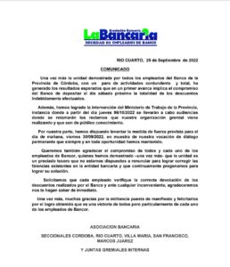 Pasada las 13 hs. y luego de llegar a un acuerdo, el Secretario Gremial de Bancarios, Pablo Bertoglio, informó que la medida de fuerza para los días jueves y viernes, quedó sin efecto para mañana viernes 30.
