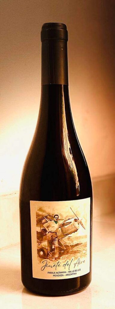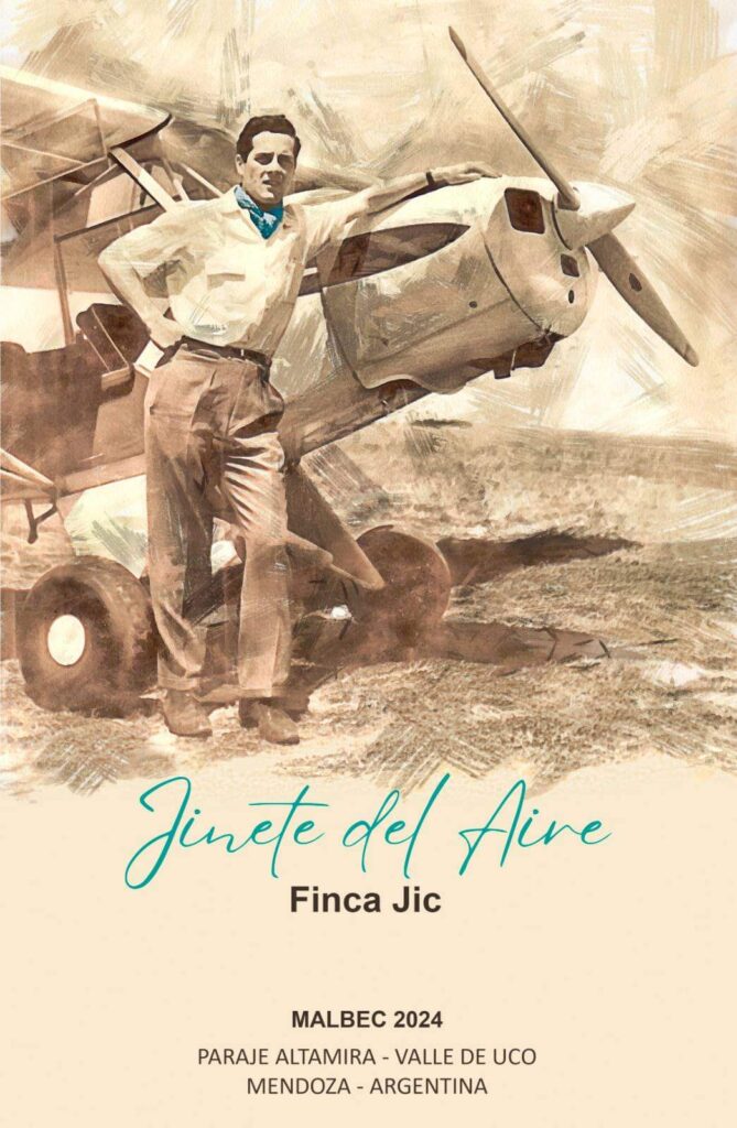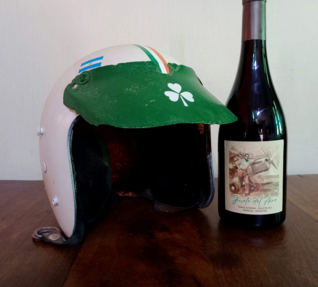 Un vino realizado en honor de nuestro aviador destacado, la etiqueta, el casco que usó mientras hacía las aeroaplicaciones, y la botella del «Jinete del Aire»