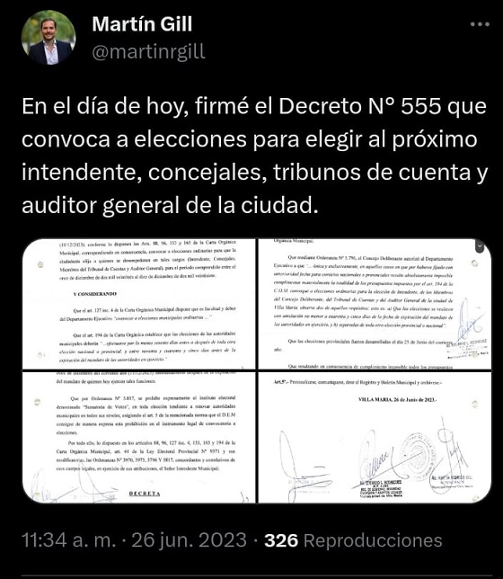 El Intendente Martín Rodrigo Gill informó desde su cuenta oficial Twitter que firmó este lunes el decreto que establece la fecha de elecciones para elegir al próximo intendente, concejales y tribuno de cuentas y auditor general en la ciudad de Villa María.